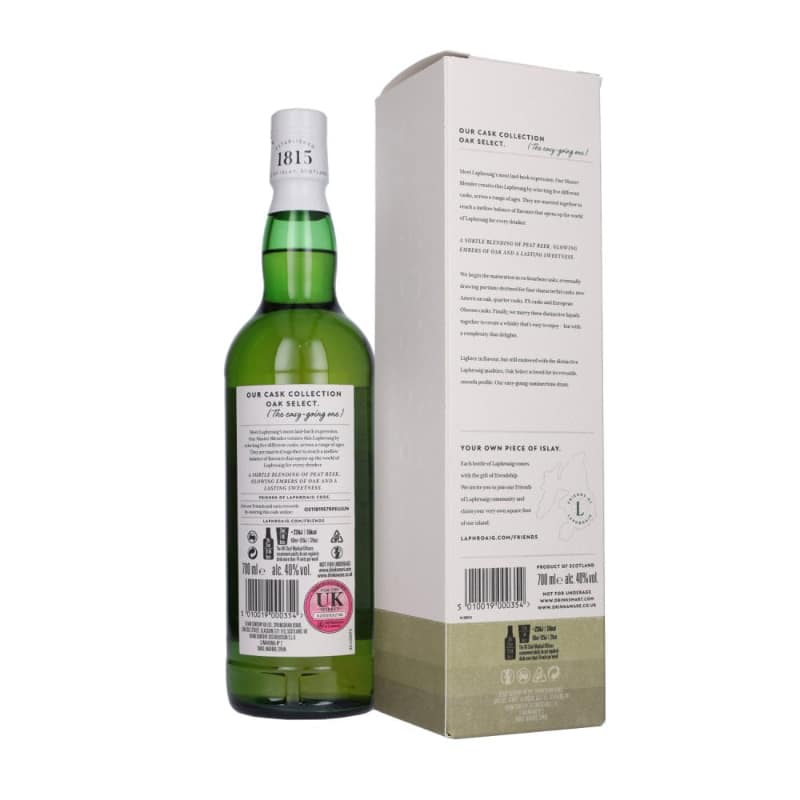 Είναι απολύτως φυσικό ότι η τέλεια εισαγωγή στο ουίσκι με τύρφη προέρχεται από μια ευρεία γκάμα βαρελιών. Γλυκό και απαλό, το Laphroaig Select αφηγείται την διαρκή ιστορία διακοσίων χρόνων παθιασμένης απόσταξης σε κάθε γουλιά. Για να δημιουργηθεί το μείγμα Laphroaig Select, επιλέχθηκε ουίσκι που έχει παλαιώσει σε βαρέλια Oloroso Sherry, βαρέλια first-fill ex-Bourbon quarter και βαρέλια Pedro Ximenez Sherry Gogsheads σε διαφορετικά επίπεδα ωρίμανσης. Τελειωμένο σε βαρέλια από παρθένο αμερικανικό δρυ – μια σπάνια πηγή ξύλου για το σκωτσέζικο ουίσκι. Η πιο χαλαρή έκφραση μας αναδεικνύει τις χαρακτηριστικές γεύσεις από φαρμακευτικό καπνό τύρφης και φύκια, αφήνοντας άφθονο χώρο για νότες κόκκινων φρούτων, λάιμ και ένα λουλουδάτο φινίρισμα.